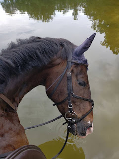 After our ride he was so hot and sweaty. I mean, it was hot and miserable with the sun just backing down anyways, but the trot to canter sets was tough. He was so sweaty he had butt foam and that had dripped down onto his boots. So... I decided to take him to the lake! But no way was I riding the epiphany down there. So I untacked and decided to even take his bridle off. He was super!