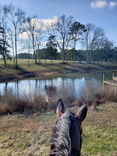 So yep... Get him responding to my leg aids... my super soft leg aids... and then go forward in my transitions so he knows I mean it. Then settle... keep his neck short (not too long), keep my shoulder blades loose, count, and then as we hit the "trajectory" of the jump... close my leg and go one mph faster each stride. As long as my leg is closed and I'm waiting... he can figure it out. I'm the cheerleader.. and it's his job to get the ball in the basket. Ahhhh... that was fun again. Then we went for another short but longer hack. Oh, and we wore our new bridle! I love it. I think he does too. :)