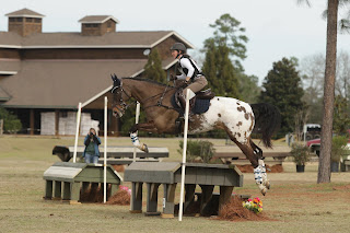 So then we hacked over to XC. We jumped a small log and the small rolltop and he jumped them beautifully! In front of my leg, forward, going, so... we went with that. I was actually feeling sort of excited about XC and not that nervous. I mean, a little nervous, but not that bad. So we started out and the first four fences went great! Then we headed to fence 5, the big table. And I guess I panicked. I'm pretty sure I just ran him at it and he got long and strung out. He started to jump it, but realized it was a bad idea and sort of skipped over the side of it. So.. big fat run out. Sigh. So we circled and he jumped it and then the next one. I had to use the crop as he kept stalling out. Then we jumped the next one or two nicely... but then we stalled out a little. I then got him going again and he jumped the corner quite nicely and into the water decently. Out of the water was sticky but only because I held. We jumped the hammock just fine and the double brush just fine. At that point, I wasn't even nervous. And those stupid fences that looked so big walking... looked average while I was riding. I was so mad at myself for screwing up fence 5. Sigh..